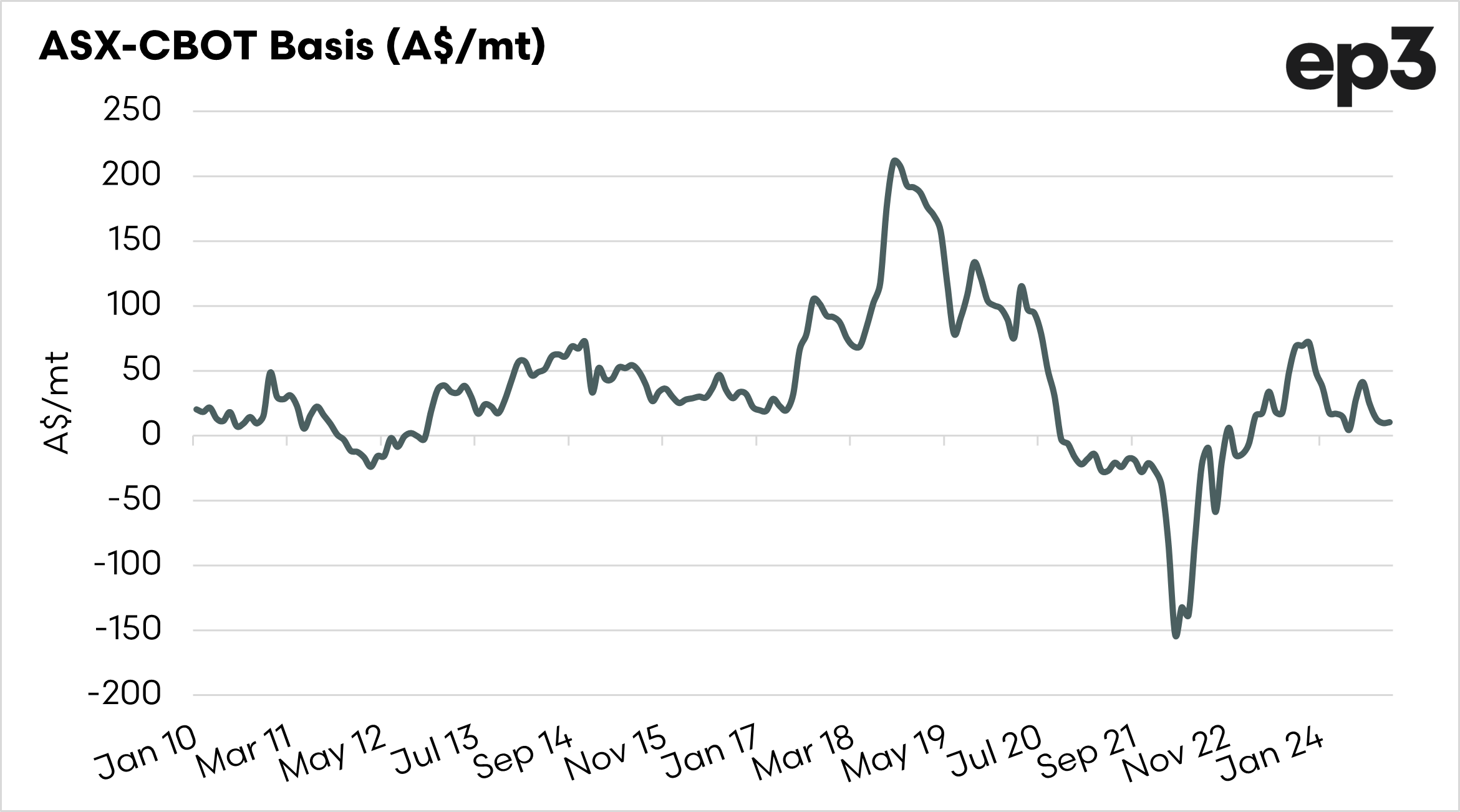 So it is important when thinking about hedging your wheat further down the horizon to be very conservative with your expectations for basis. It could be A$50 giving you an end price of A$393 or it could be -A$50 providing a result of A$293.