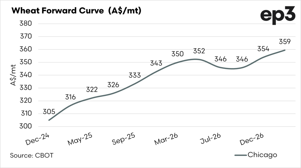 The wheat forward curve is currently in contango, where the future months are at a premium to the present. The nearby contract is currently at A$305, but the contract for next December is at A$343.