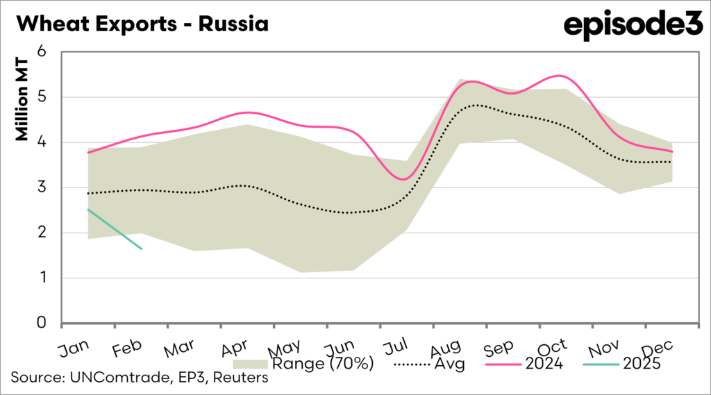 In December, Russia also amended the export quota on wheat from mid-February to June to 11mmt, increasing export tax. This has been done in order to prioritise the domestic market, and the cynic in me says to help support higher wheat pricing in overseas markets.