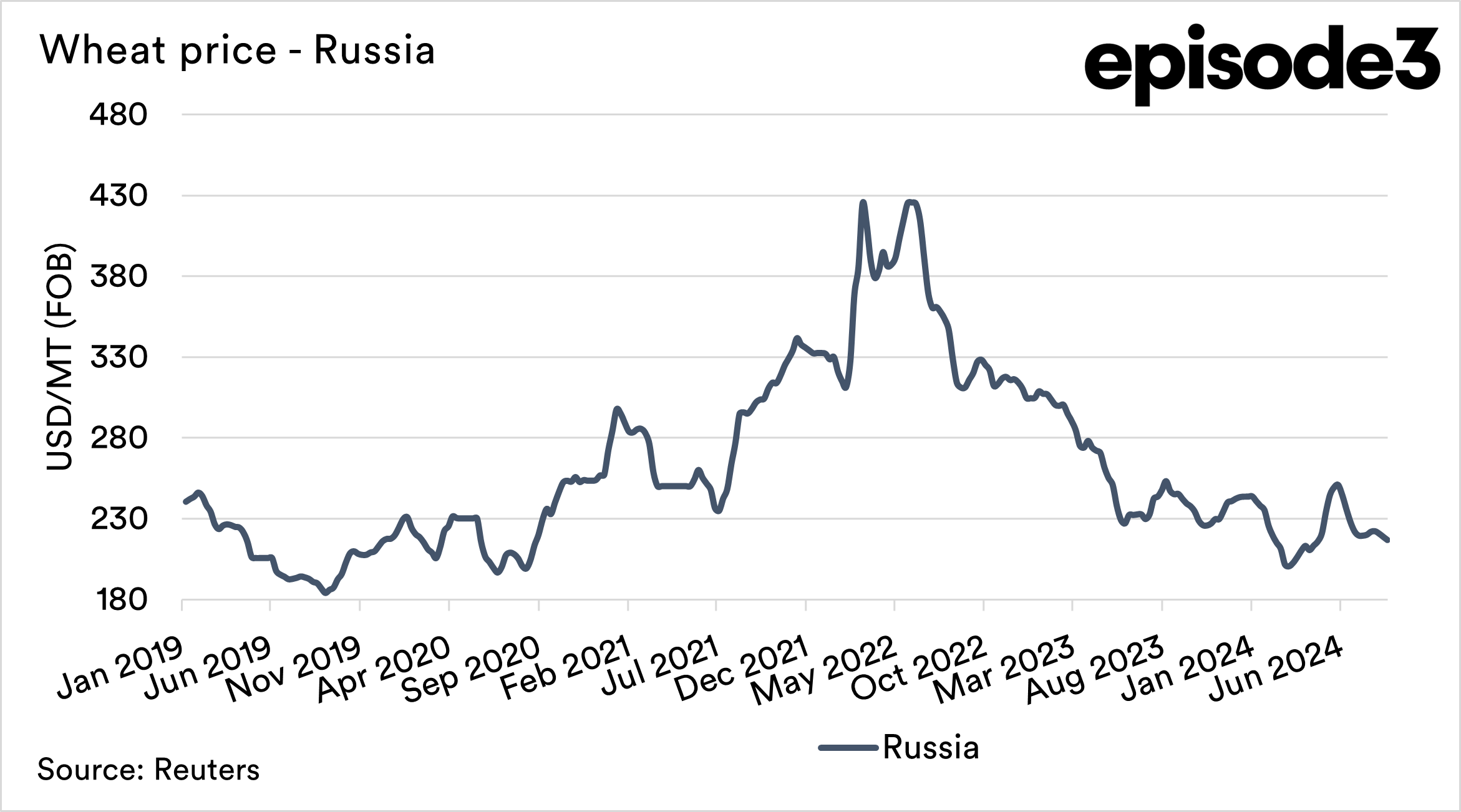 The result of this is that there will be less Russian wheat on the global market. Last year, according to Andrey Sizov, exports of wheat were 52.4mmt, and this year, the expectation is for 44.2mmt, a significant reduction.