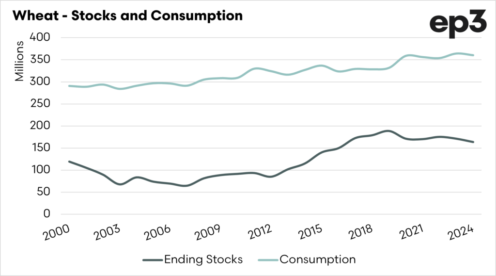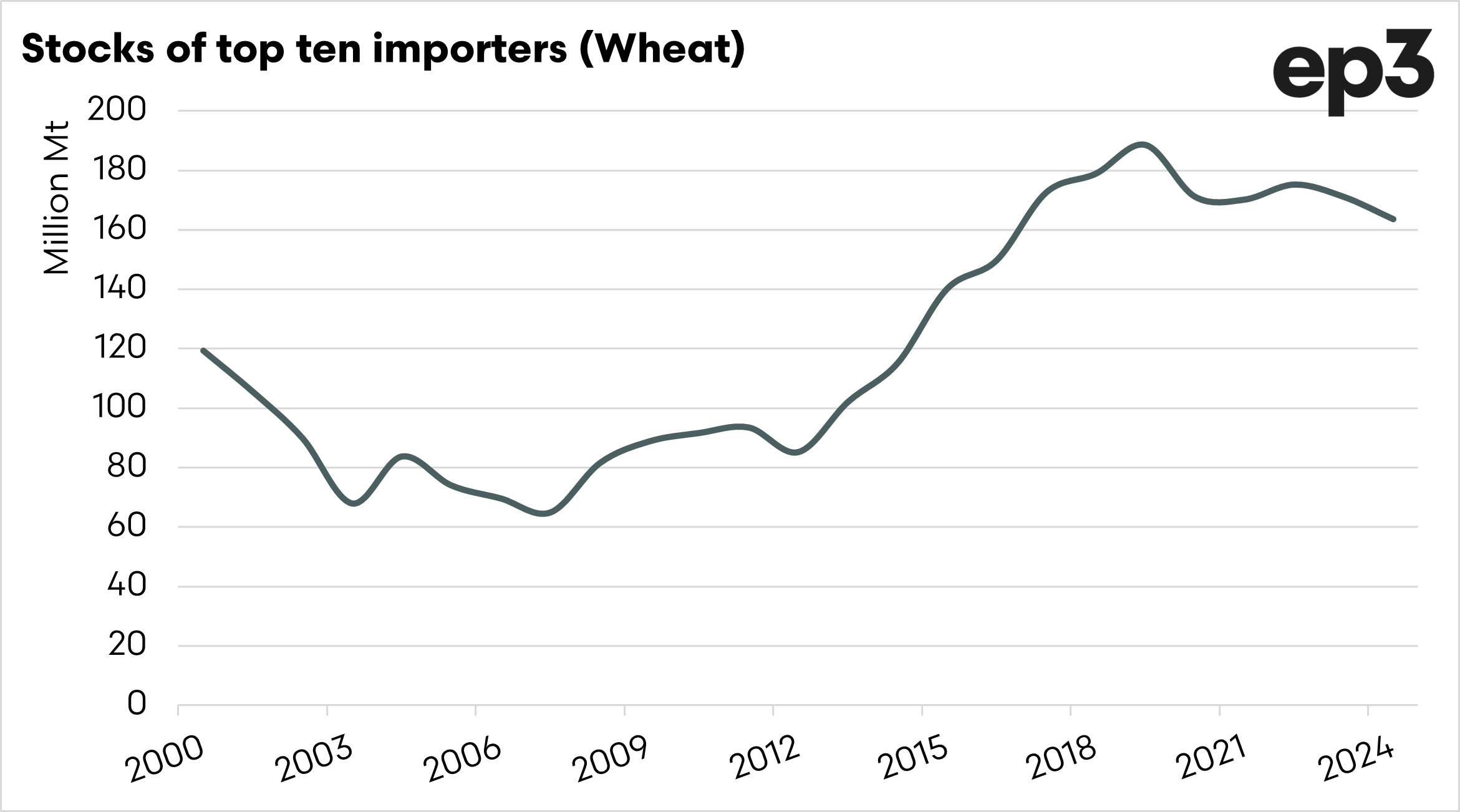 The first chart below shows the stocks of the top ten importers of wheat, which account for around 50% of total imports.