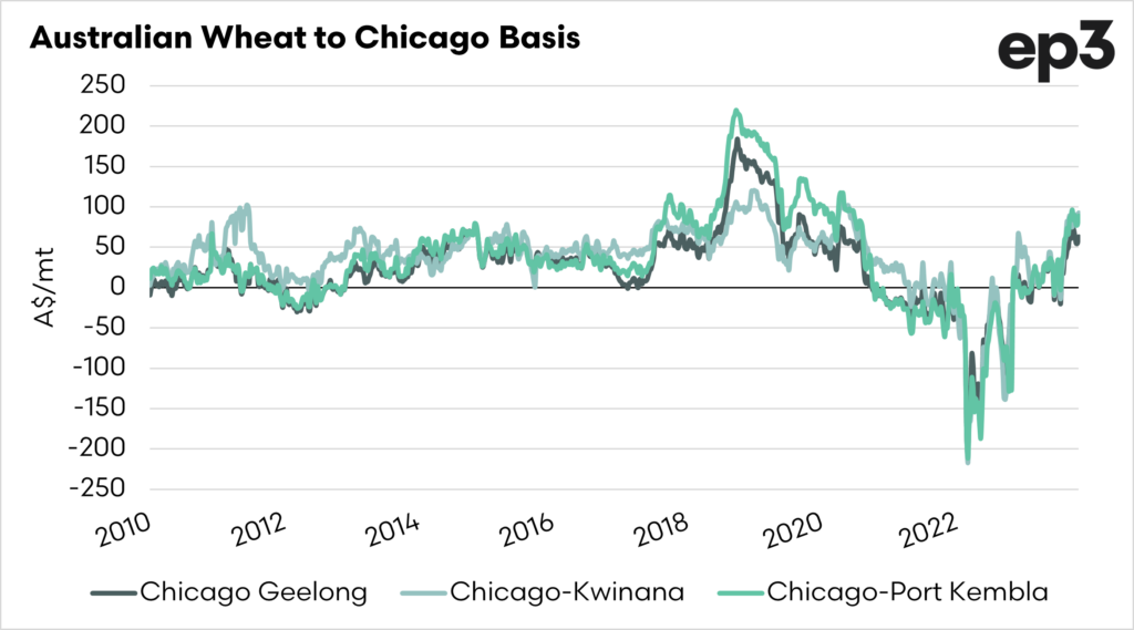 The chart below shows the basis between Australian wheat (APW) and Chicago since 2010. In this chart, we can see that in recent years, we were at a massive discount to Chicago, this being as a result of the huge surplus of wheat – the trade didn’t need to pay up to get what they required.