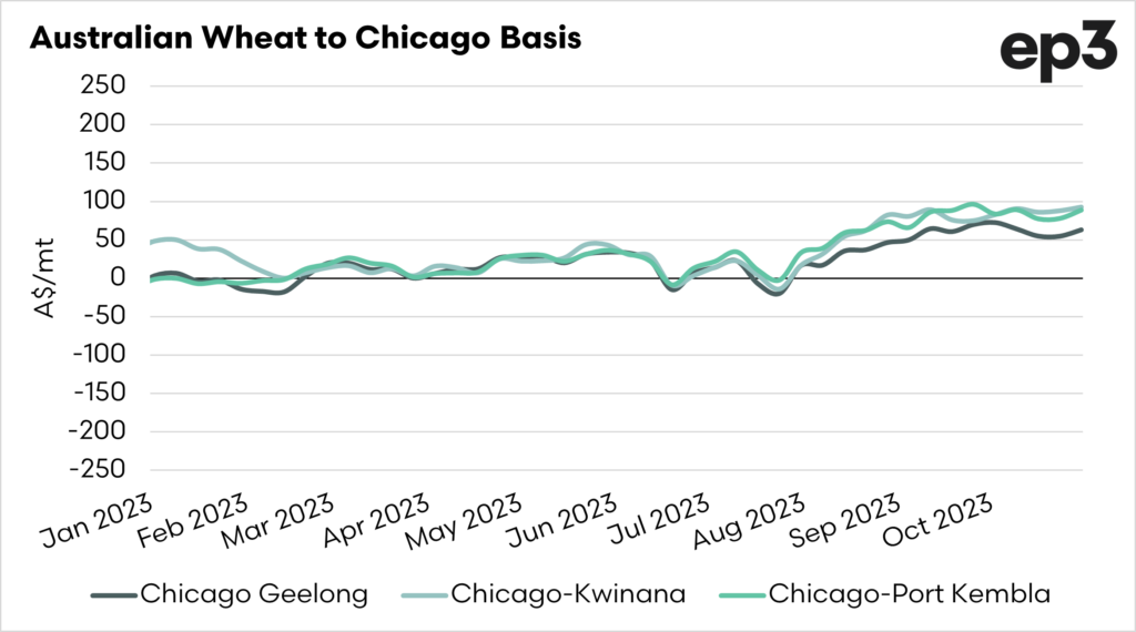 The second chart below zooms into 2023, and we can see that the basis really started moving to a stronger premium in August. This makes logical sense. This is the time when we start to get a better insight into whether the crop will make it or not.