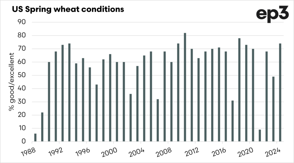 I wrote today about the poor conditions of wheat in France. The opposite is in play in the US spring wheat crop.