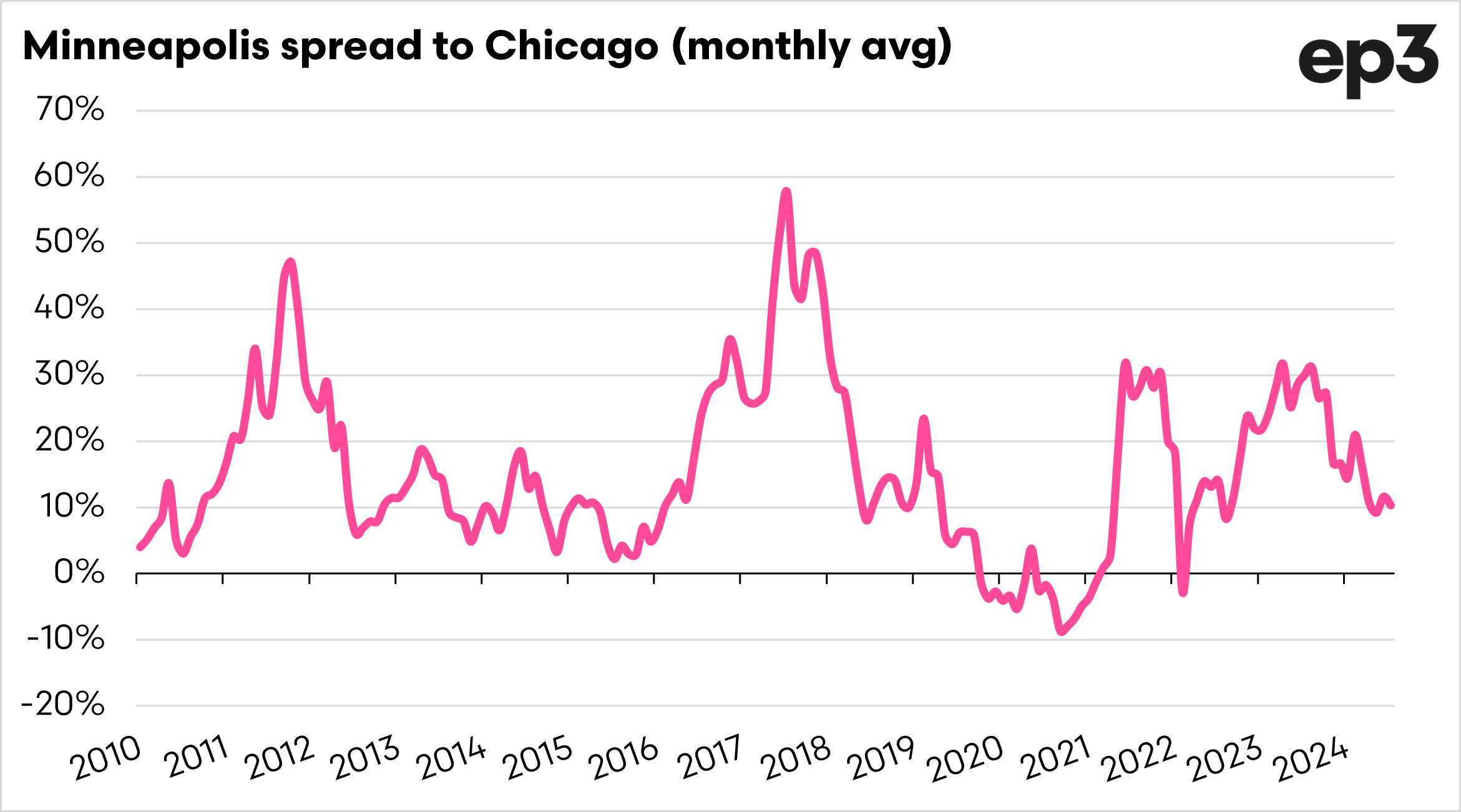 The Minneapolis wheat futures contract covers the spring wheat. Minneapolis tends to have a strong premium over Chicago due to its higher protein content.