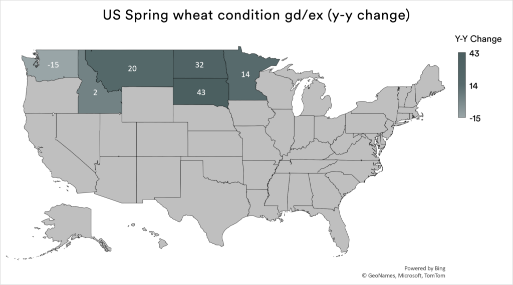 The first chart below shows the US spring crop. The US spring wheat crop is currently at 74% good/excellent. This is the best since 2018 when this time of year it was 78%. The map shows the year-on-year change in conditions. The most important states are all showing significant improvements.