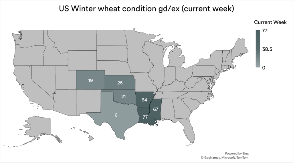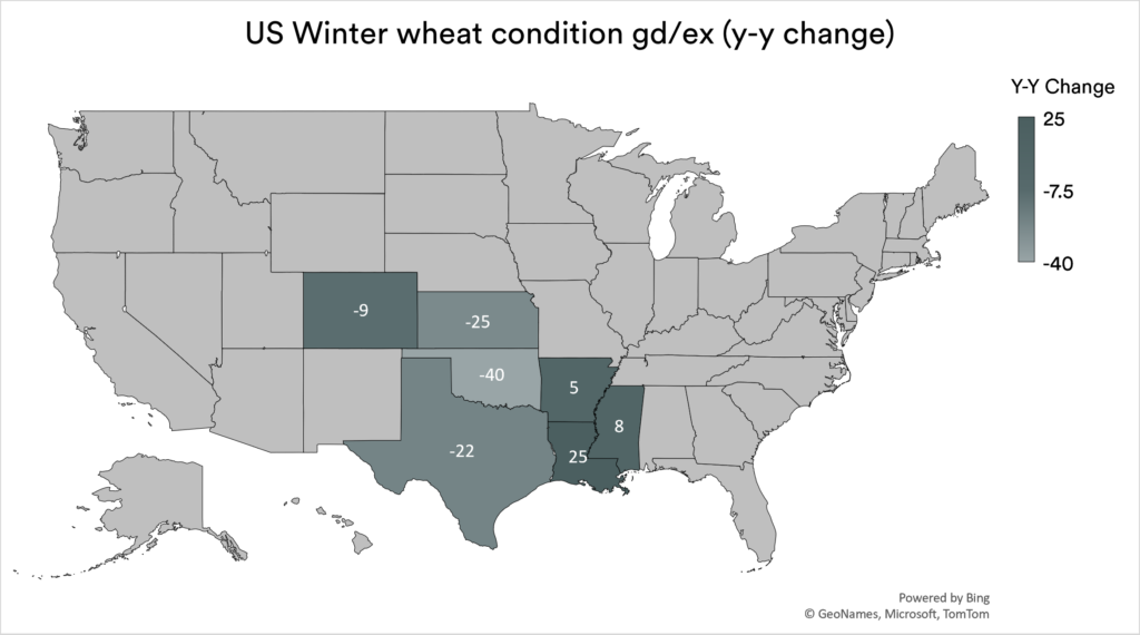 In this map, we see a low volume of the crop considered good/excellent in Colorado, Kansas, Arkansas, and Texas. The second chart below shows the year on year change between the two.