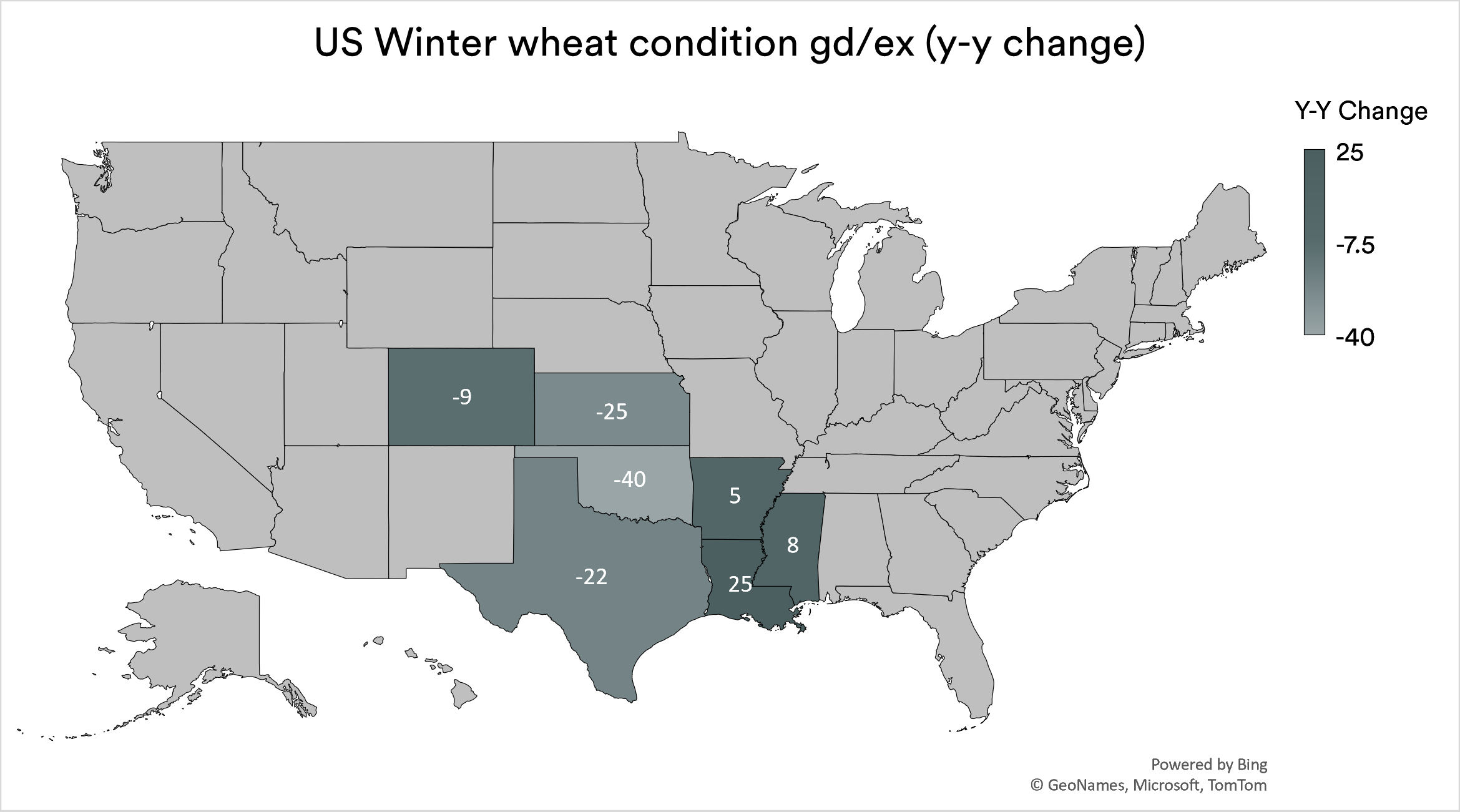 There will be more state data released in the coming weeks as the crop is inspected, but we expect that the conditions will marry up with the drought map. The US winter wheat crop is in a precarious situation.