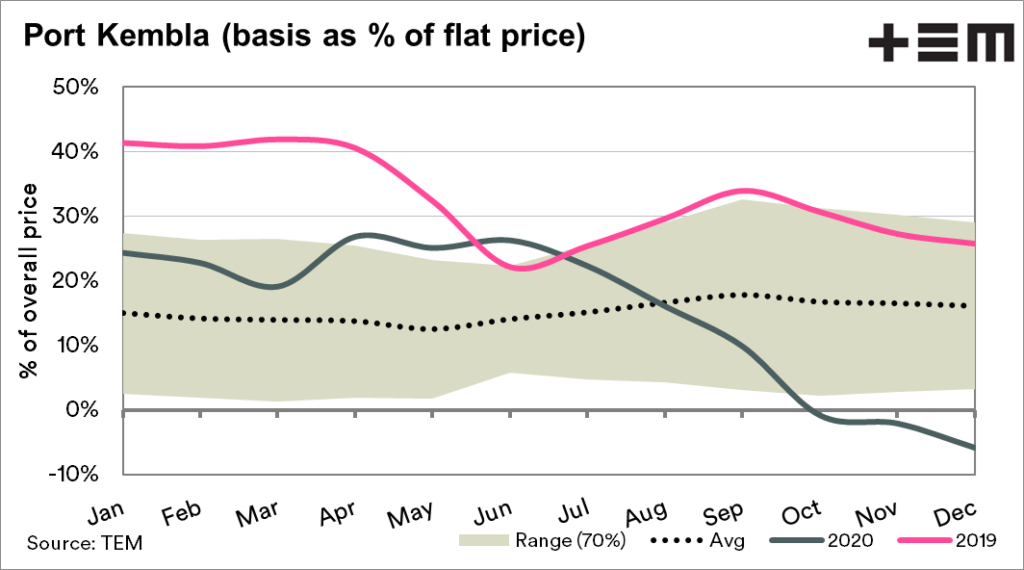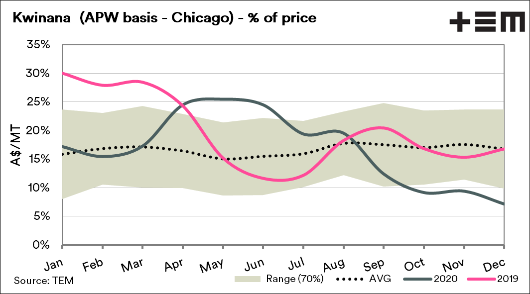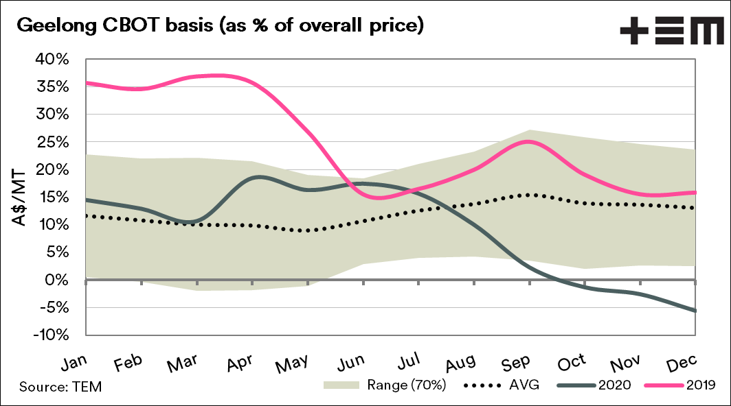 Historically basis has represented around 10-15% of the overall price received by Australian farmers. This year all port zones had dropped well below the average, with the east coast dropping into negative territory.