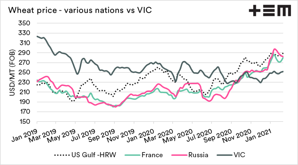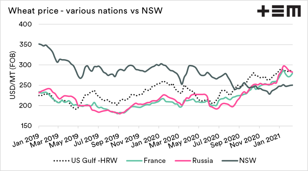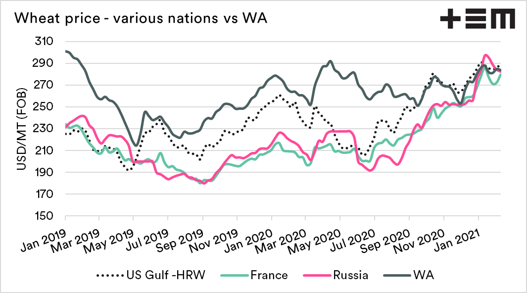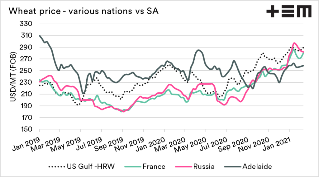 I have chosen a couple of nations, France, Russia and US gulf, with comparable protein levels. These values have been converted into USD/mt FOB (free on board). This is to provide a more direct comparison.