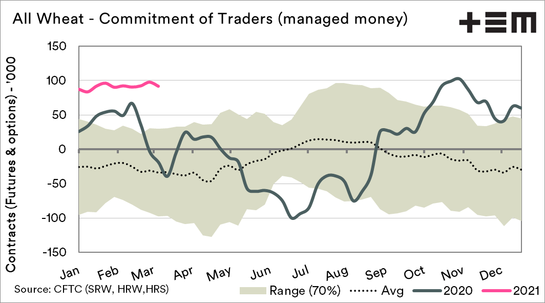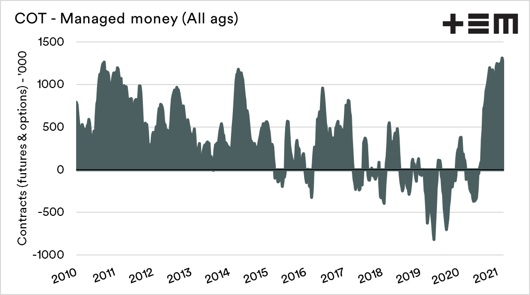 The speculator view of the ag markets is favourable at present. It is essential to be aware that this sentiment can change quickly as they ‘take profits’. If this occurs, then we can see very quick corrections.
