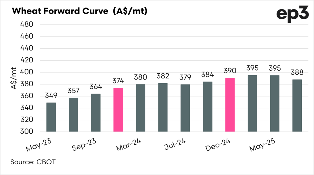 The first chart below shows the forward curve for CBOT wheat. I have highlighted the next two contracts which correspond with the Australian harvest. The coming harvest is pricing at A$374/mt.