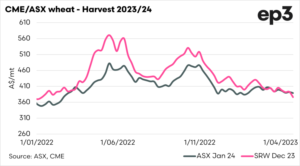 The second chart shows the ASX and CBOT wheat price for the coming harvest. At the moment the ASX contract is pricing at A$389, a premium to CBOT. If you lock in the ASX price, you would effectively be locking in a large proportion of the basis to Australia, although not all to your local price.