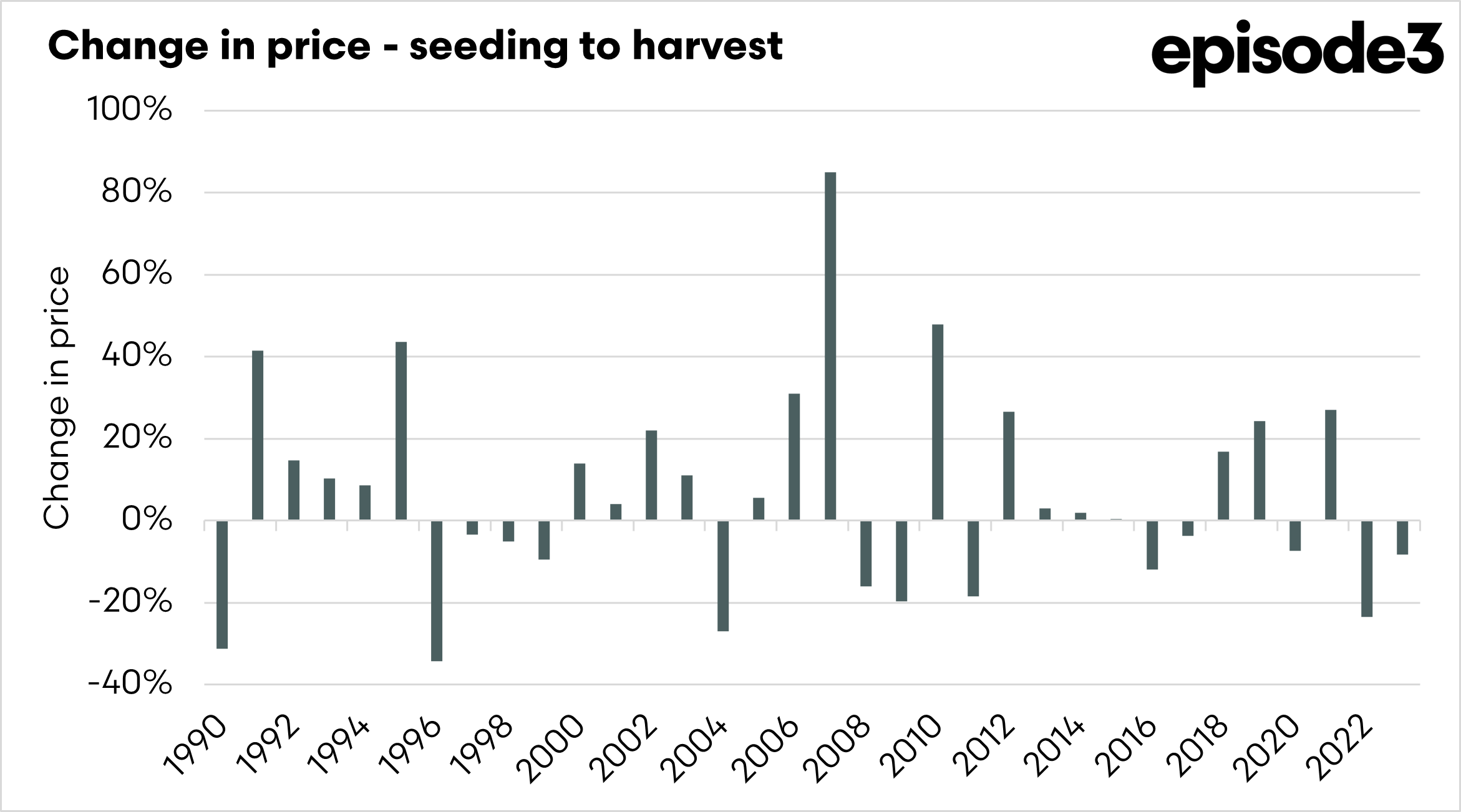 When a farmer considers whether to plant wheat in April, the current price can seem like a tempting signal to guide the decision. After all, if prices are high at seeding time, it might feel like a safer bet that the crop will be profitable. However, while April prices do show a strong correlation with December prices (around 0.72), they don’t guarantee a positive outcome. History shows that in 43% of years, the harvest price was lower than it was at seeding. So, planting based on a strong April price alone can backfire if market conditions shift.