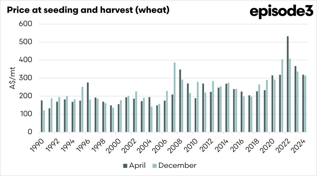For this analysis, we are using the CBOT wheat price (in A$), which gives a good indication of the global price for wheat and influences the price we receive in Australia.