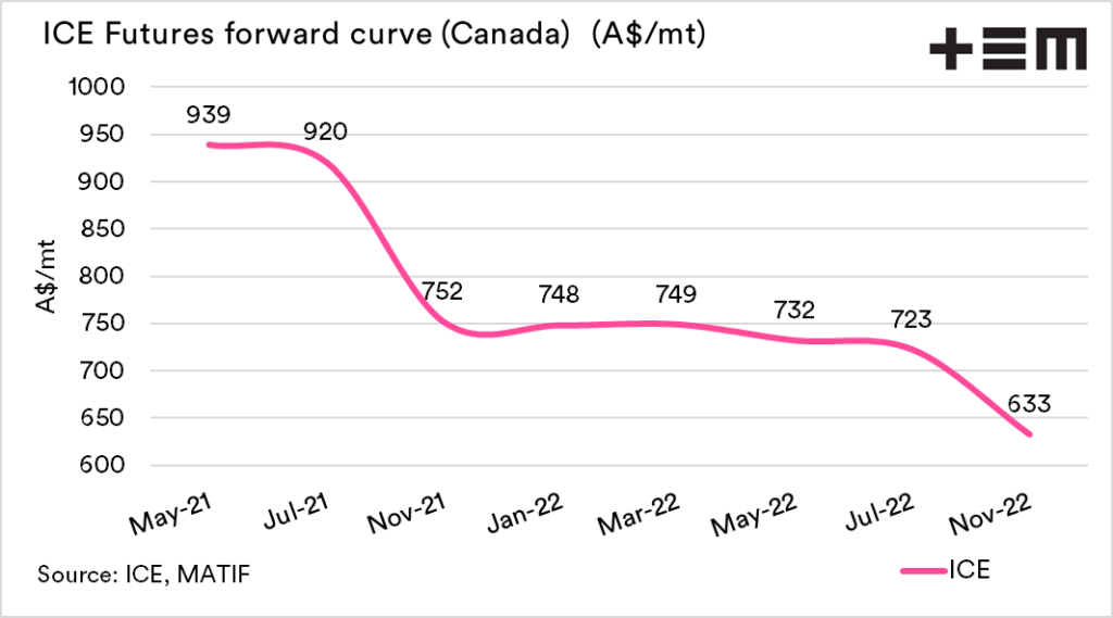 The second and third charts show the ICE (Canada) and Matif (France) canola (or rapeseed) futures. The market is currently displaying a very strong backwardation structure.