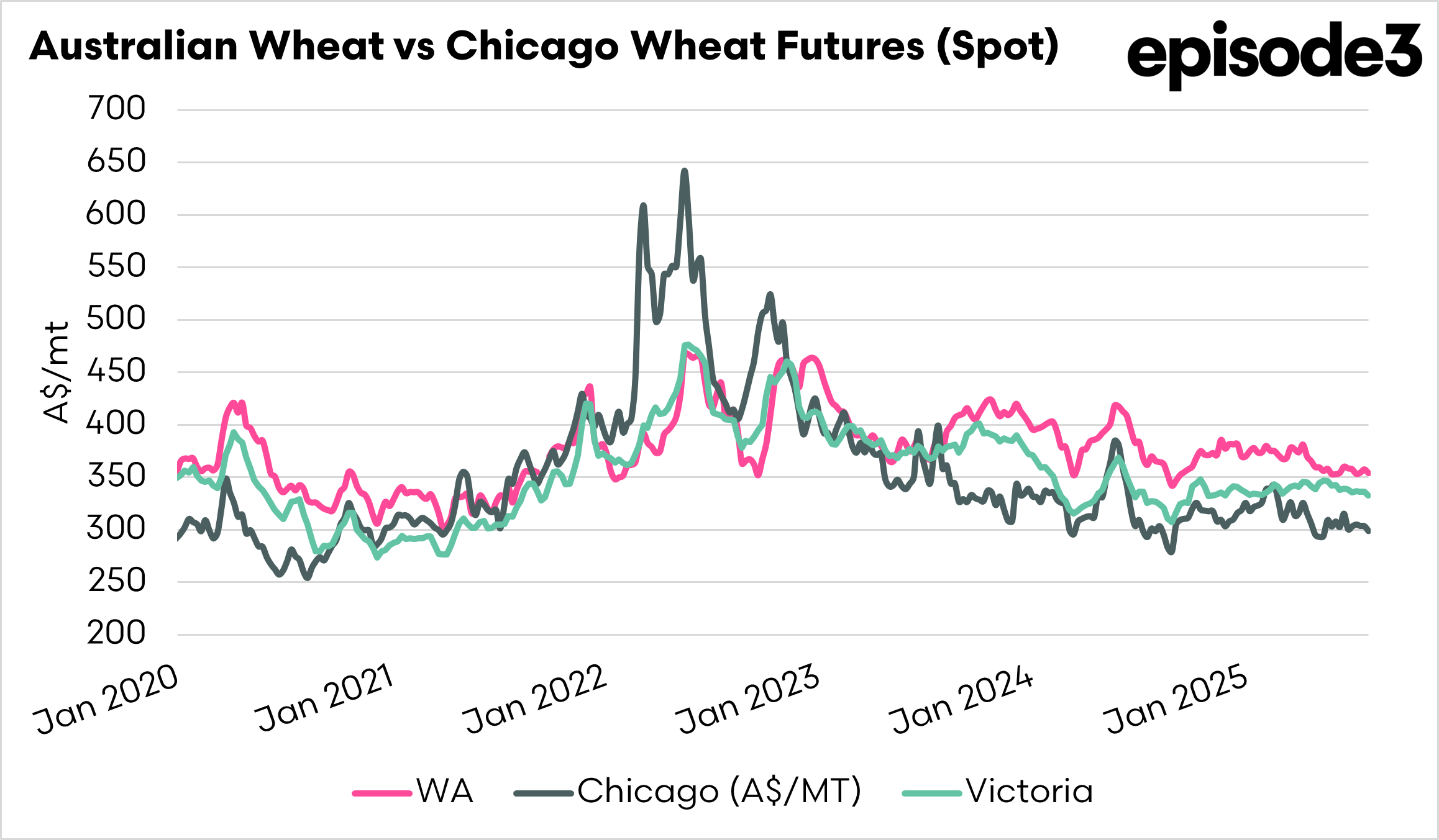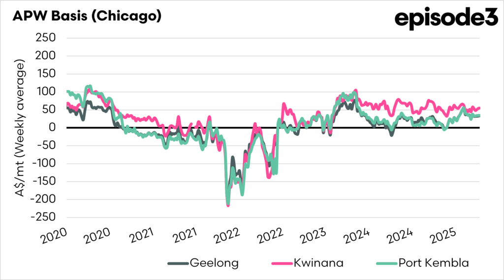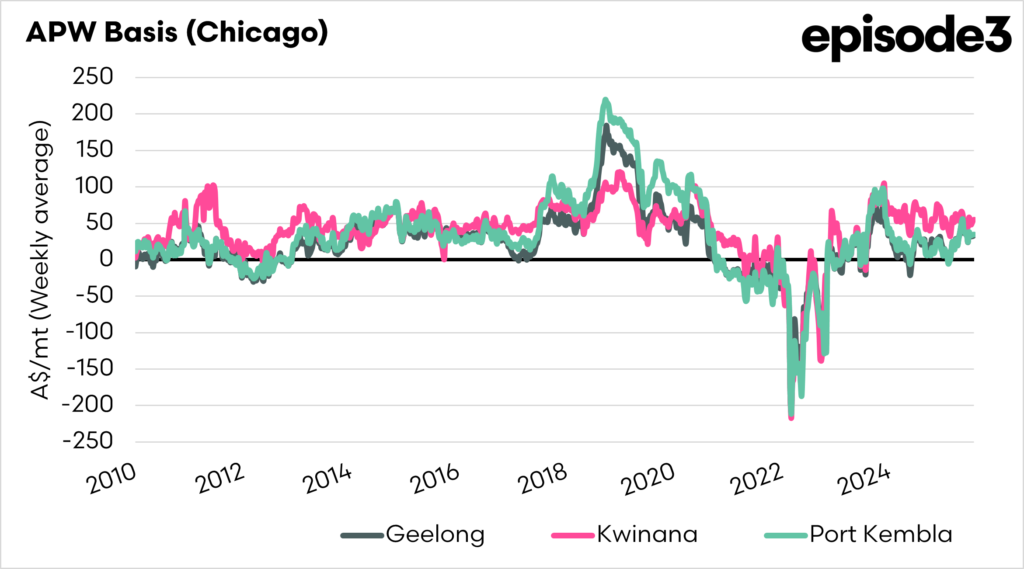 At the moment, the basis levels for Australian wheat are positive, with premiums across all port zones for our wheat. The conditions in Victoria and South Australia have not resulted in a strong drought premium this year because NSW has been looking extremely well, and recent rains will continue that trend.