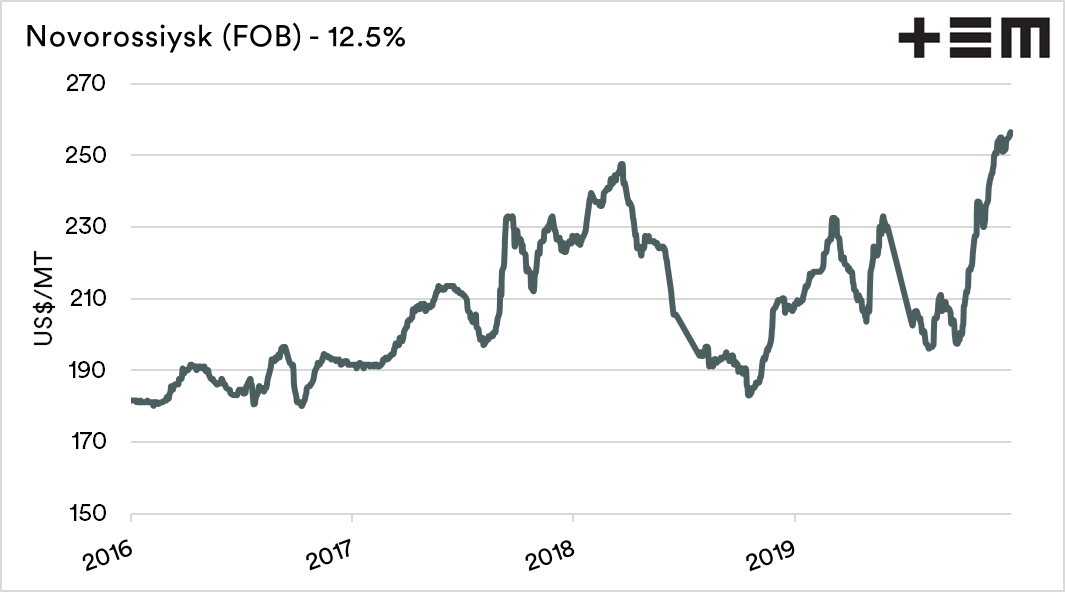 Russian export prices were slightly higher this week, supported by the domestic market. 12.5% wheat prices in deep-sea ports rose US$1 to US$254/mt, in shallow ports were up US$2 to US$235/mt.