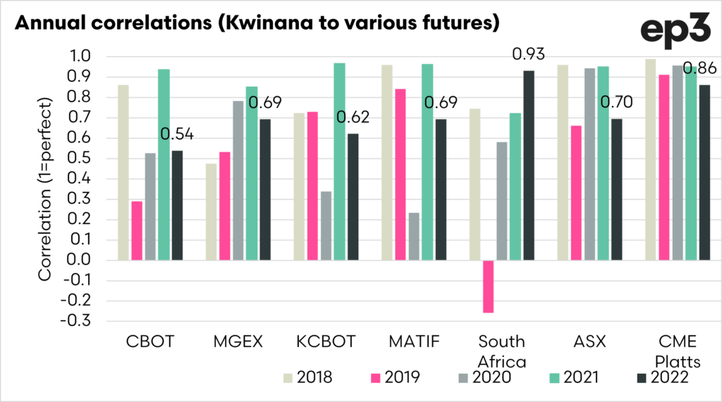 What we can see in the data is that most contracts have a consistent high correlation. Interestingly, during 2022, the South African wheat contract has shown the strongest correlation. It would be important to point out that it has a low consistency over time.