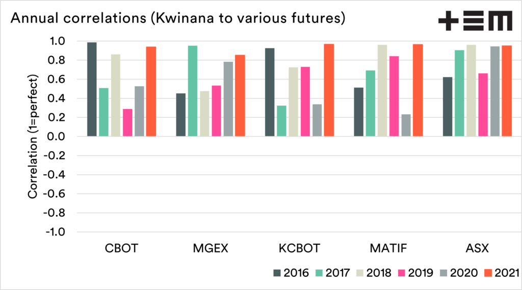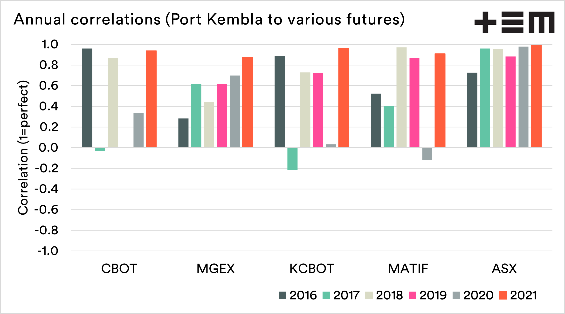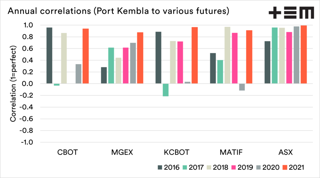 The charts below show the annual correlation between Kwinana and Port Kembla to various futures markets. A perfect correlation is 1. These are taken as a monthly price.