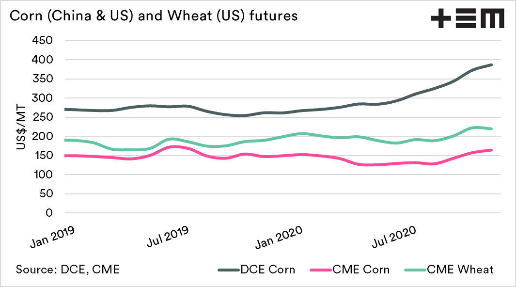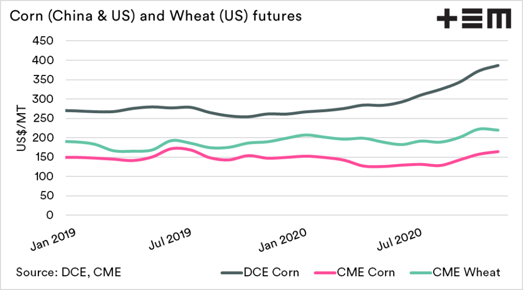 The first chart below shows the monthly average price of corn (in China & USA) and wheat futures. The corn market has rallied due to strong requirements in China, for much of the last six months wheat followed.