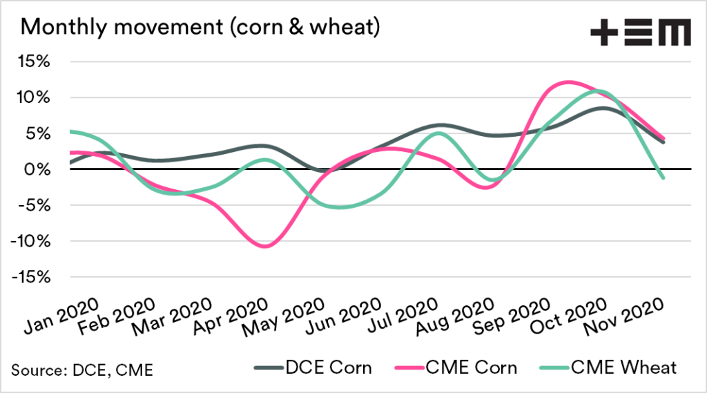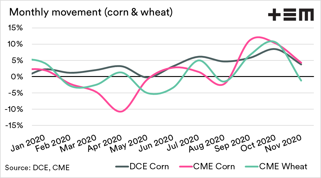 The second chart displays the change in price for the monthly average, and we can see that Chinese and US corn has followed one another closely with a 4% rise during November. At bearish tone for wheat has resulted in prices declining 1%.