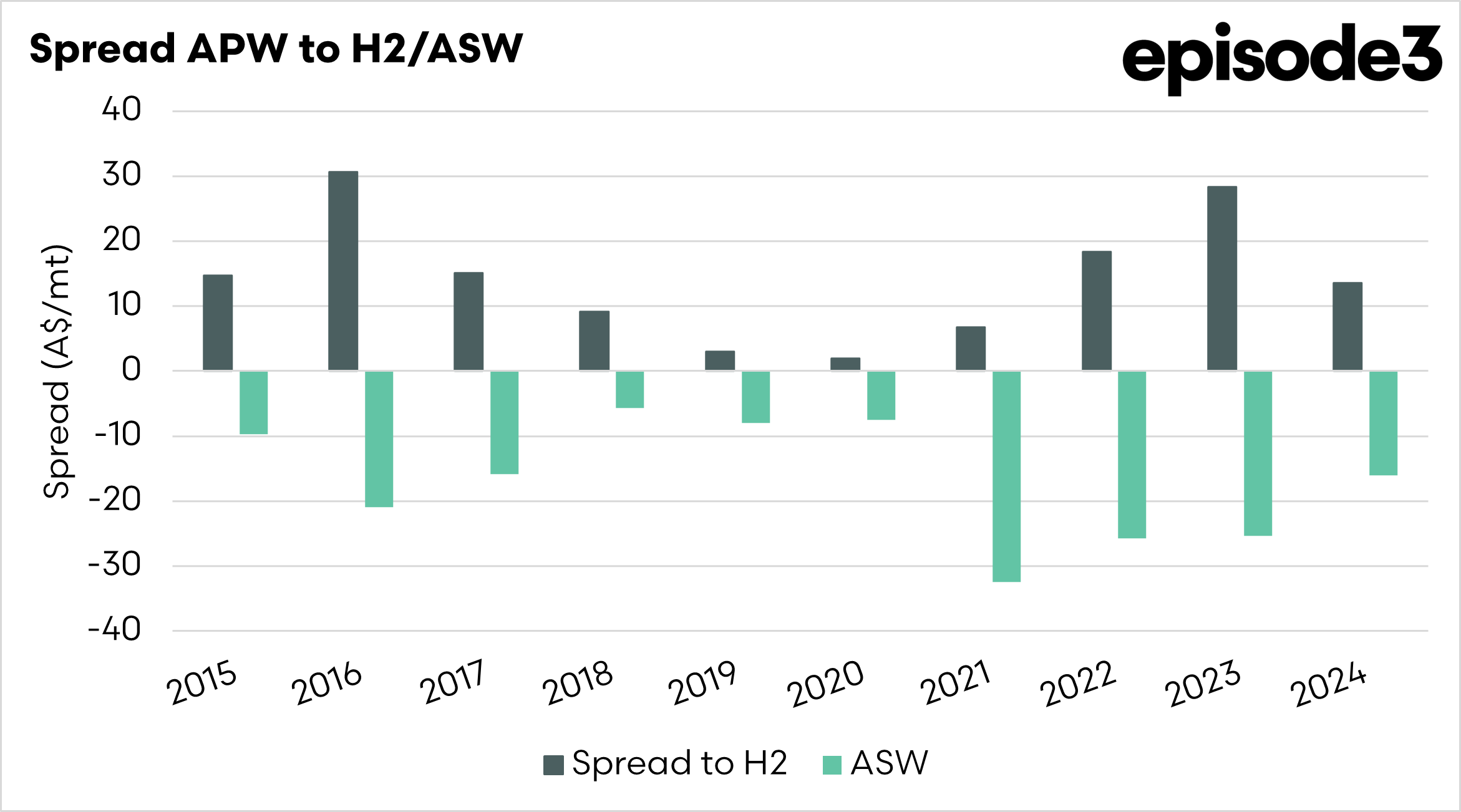 The chart below shows the spread from APW1 to H2 and ASW over the past decade. It shows a bit of a story. In years when it is dry (2018-2020), and supply is limited, then the premium or discount from APW1 tends to be minimal. During those periods, wheat is wheat.