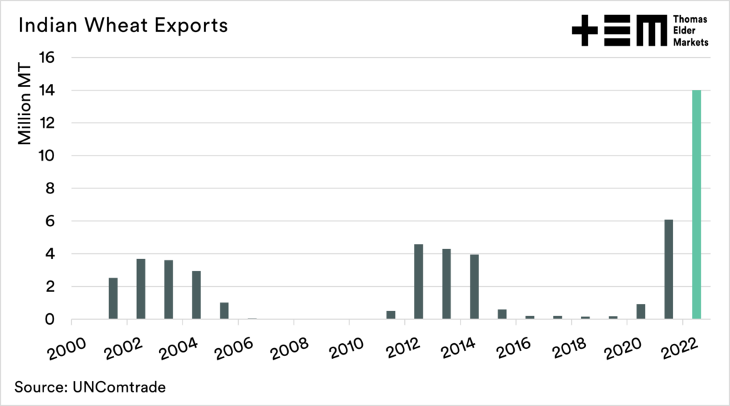 There are projections of between 12 and 16mmt of wheat exports this year. The chart below shows the annual export volume of Indian wheat since 2000. The largest year was last year; the projections for this year are almost double.