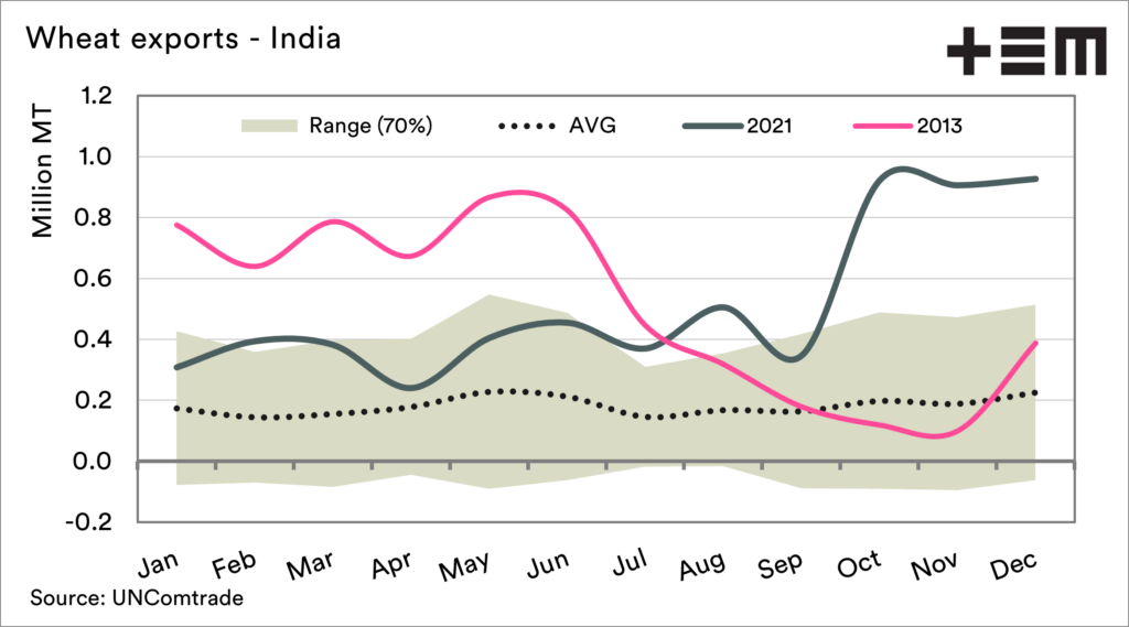 Last year we wrote about this in India to test Australia on wheat?. Interestingly India is quite seasonal, with some years as an exporter and some as an importer dependent upon their conditions (here).