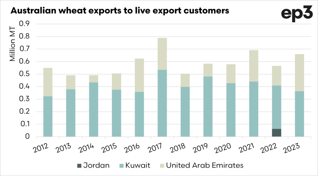 If we look at the chart below, the three major live export customers, who also import wheat from Australia, is displayed. Over the past twelve years, Australia has exported an average of 586kmt to these nations. This isn’t insubstantial, but it’s not a huge volume of our overall trade.