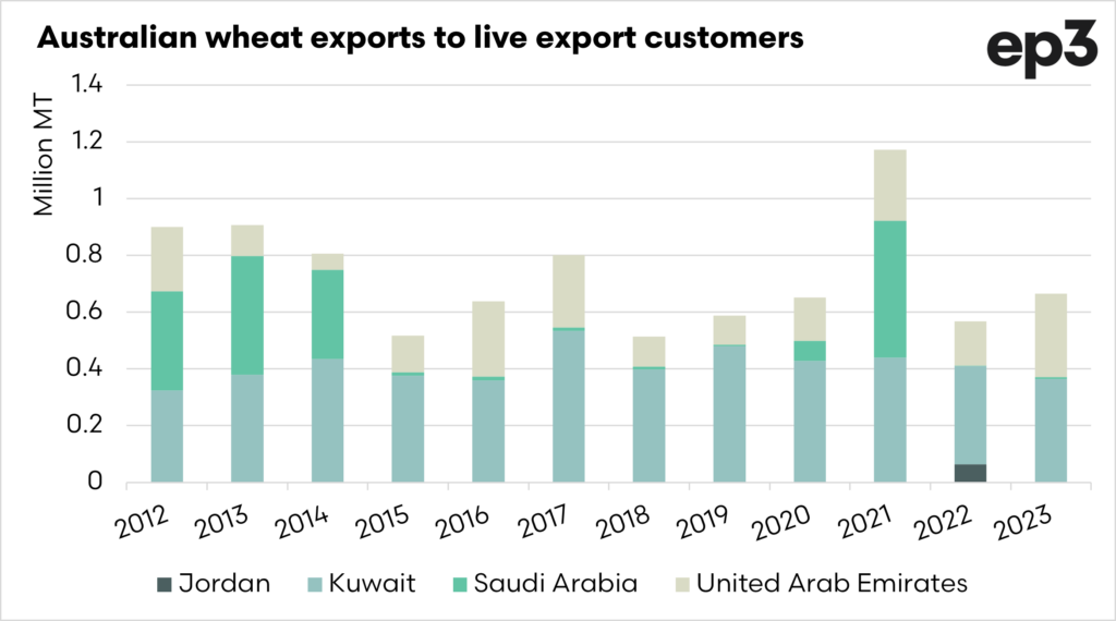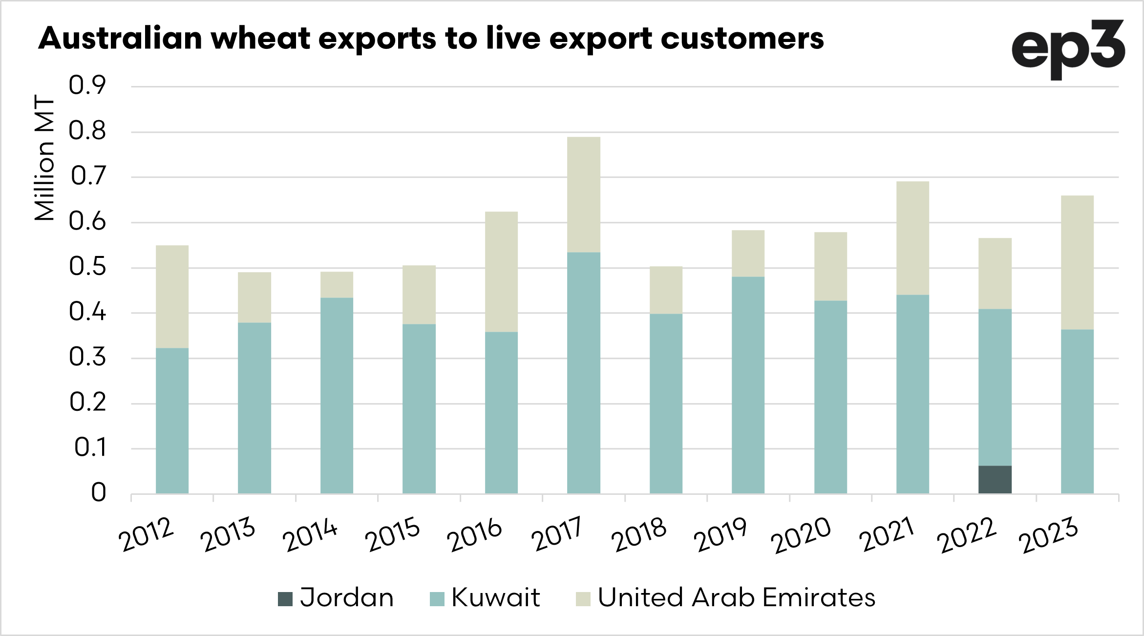 If the Middle East is concerned about food security and the impact of the live export sheep trade, it would be inadvisable for them to place restrictions on purchases of wheat (or other grains) from Australia as a tit for tat action.