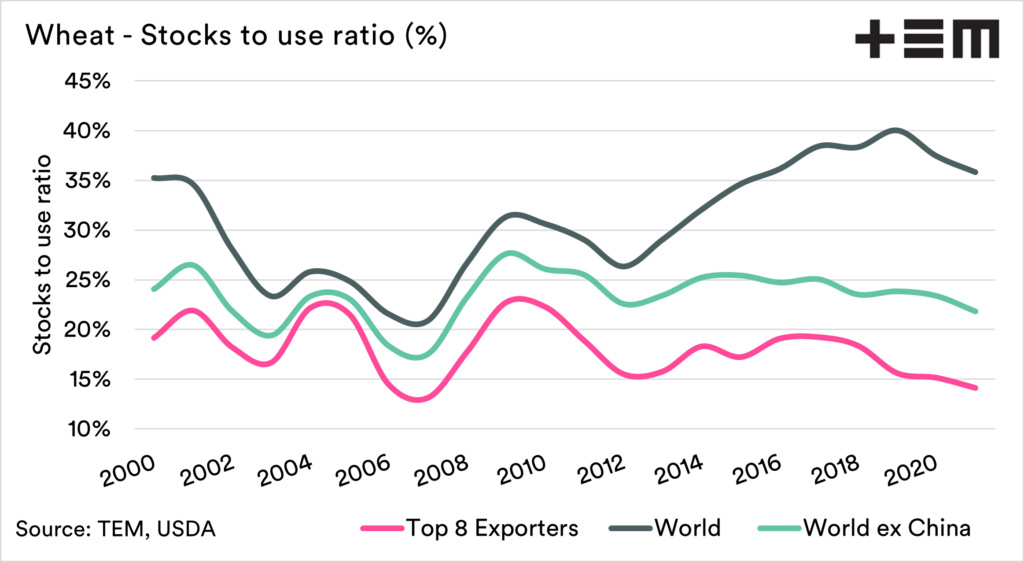 In part, this has been balanced by an increase in exports from Australia of 2mmt and India of 1.5mmt. The result is that ending stocks within the major exporters is increasing from 51mmt to 56mmt.