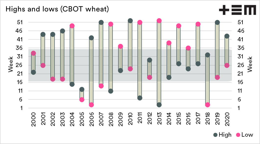 The chart* below shows the highs and lows for CBOT wheat (spot) for each year between 2000 and 2020. The peaks are shown as a grey circle and the lows as a pink circle. Throughout the majority of the period since 2010, the peak has been during the middle of the year. The past two years have reversed this trend.