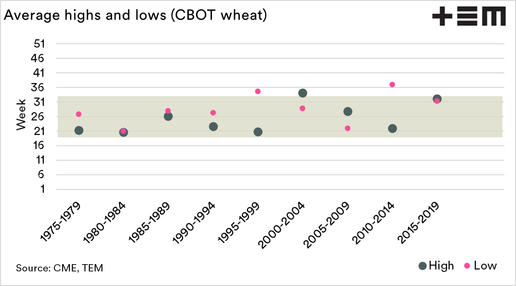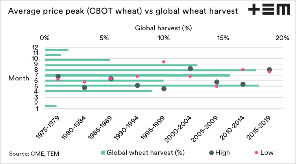 - The peak of CBOT wheat pricing (at least for spot) has occurred during the June – August period for a large part of the past decade.