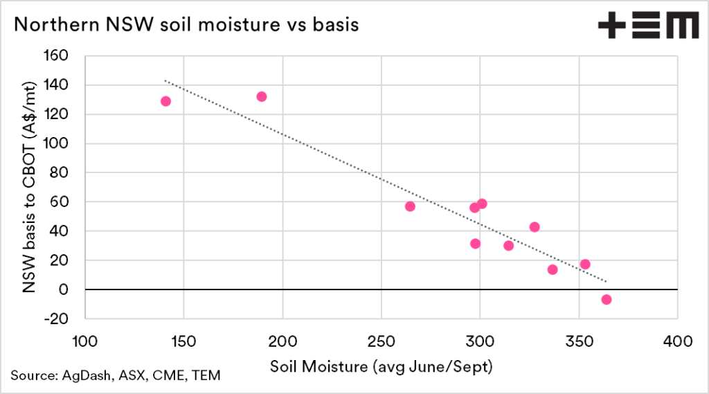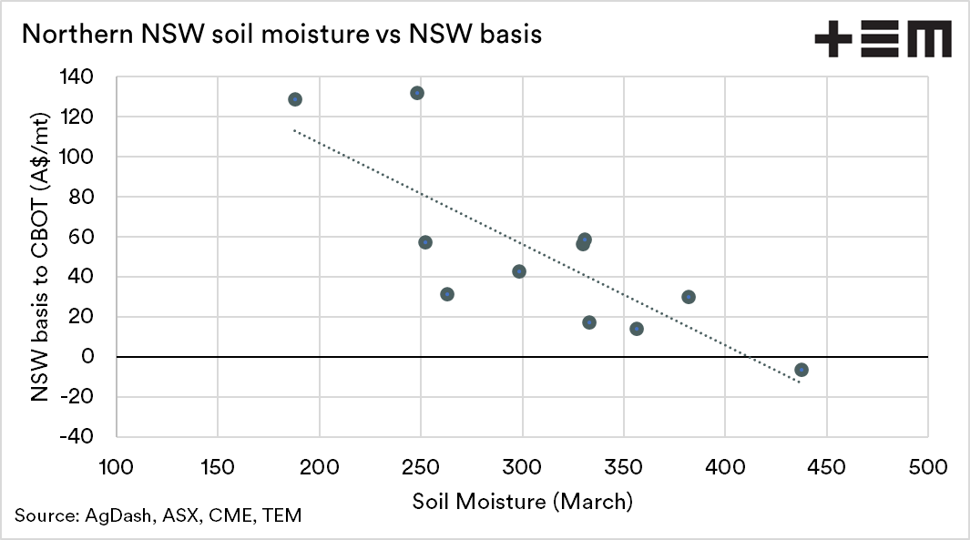 The rainfall received during March in NSW and the subsequent high soil moisture is likely to lead to decent conditions through the growing season. The solid conditions, in turn, can lead to lower basis levels versus Chicago.