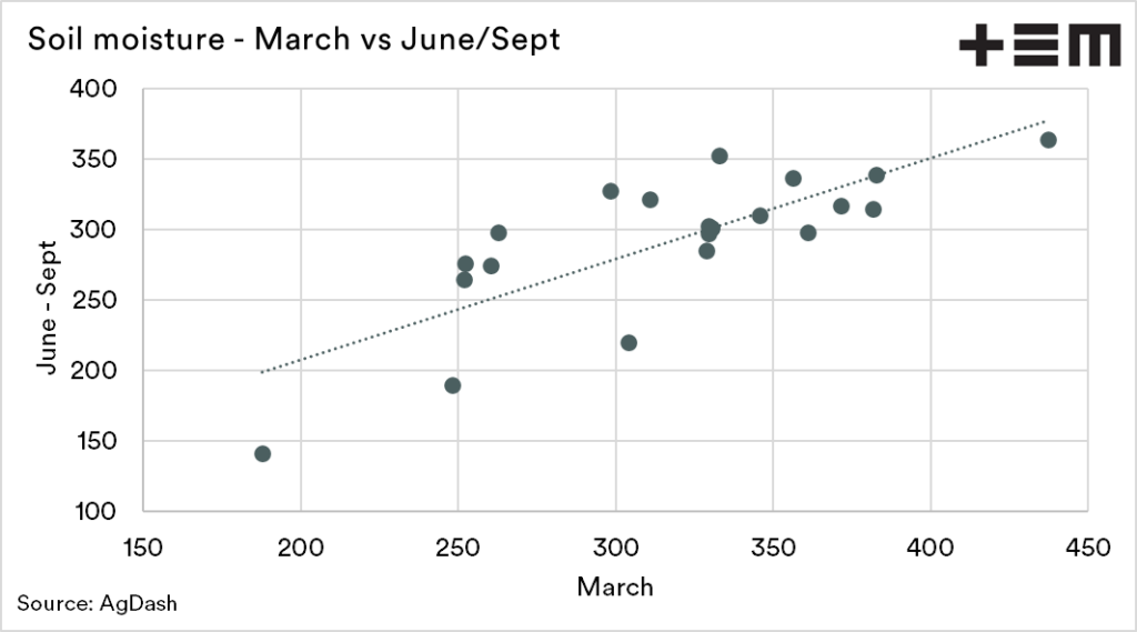 The chart below shows the relationship between soil moisture* in March for Northern NSW vs the NSW annual basis. The correlation of this relationship is -0.8.