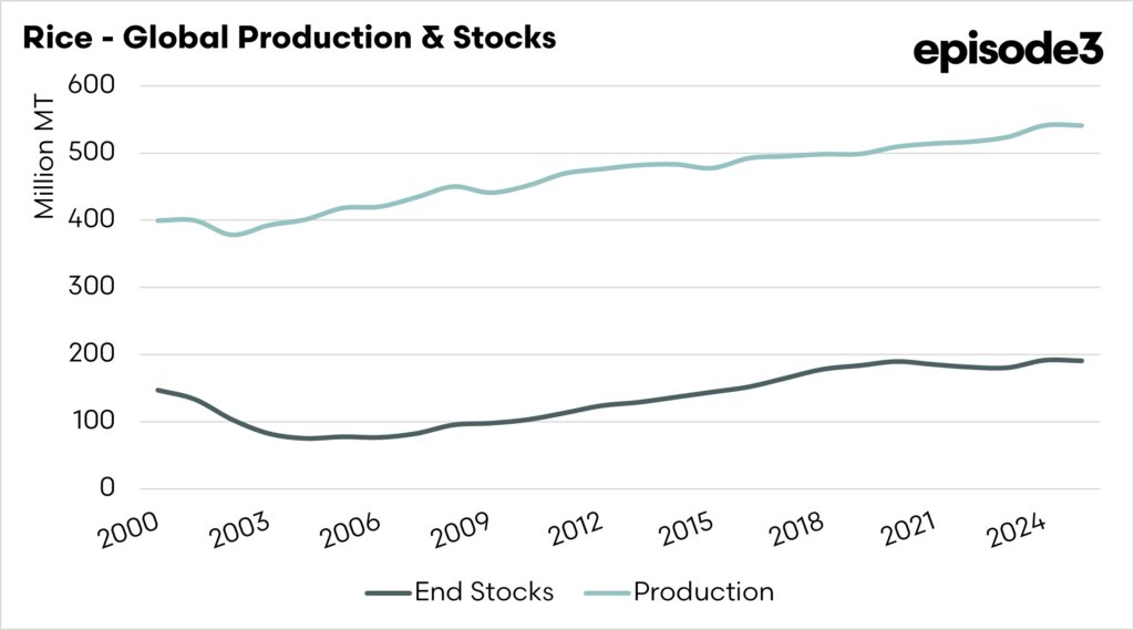 At the same time, consumption has also increased, but not fast enough to prevent a gradual rebuilding of stocks. Global ending stocks have risen from <100mmt in the mid-2000s to 190mmt in recent years, even as exports have expanded sharply. Export volumes have more than doubled since the early 2000s, underscoring that rising production in key suppliers has led to larger surpluses entering global markets. This combination of higher yields, resilient production and expanding stocks underscores why rice has increasingly contributed to the broader grain glut, adding weight to global balance sheets and acting as a quiet but important influence on price dynamics across the wider grains complex.