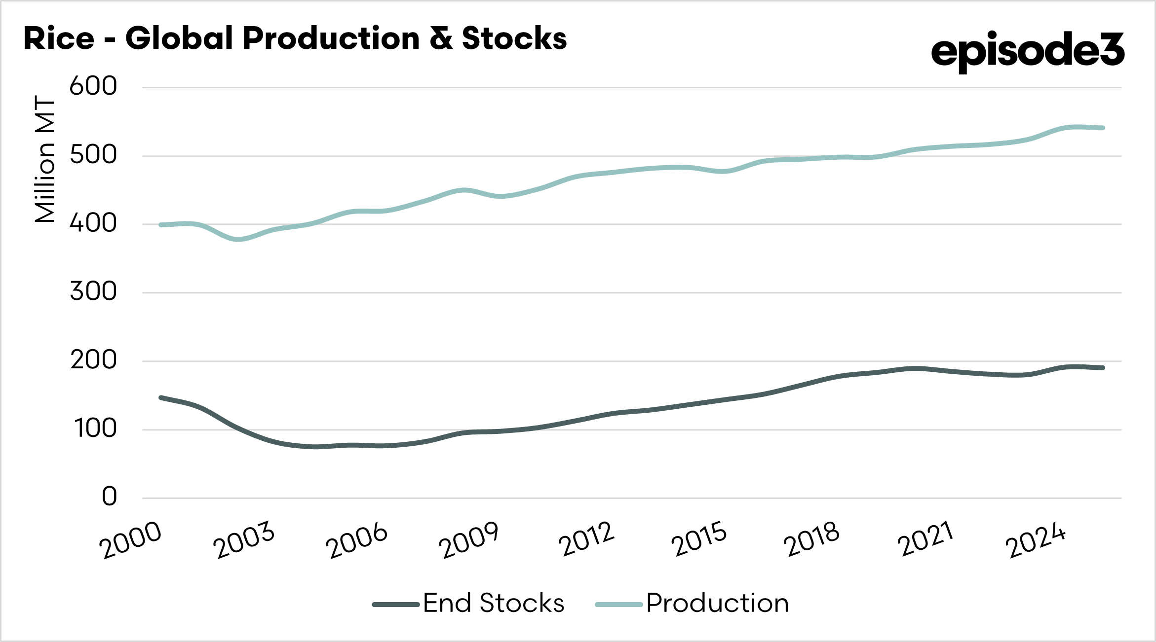- Global ending rice stocks have rebuilt to around 190 million tonnes, compared with less than 100 million tonnes in the mid-2000s.