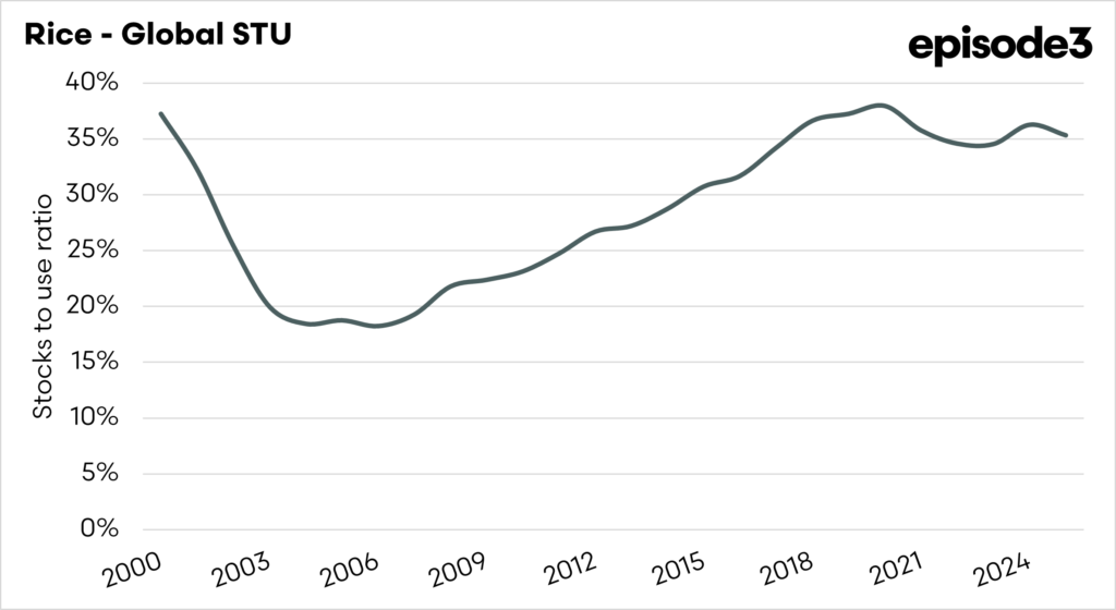 Globally, the current STU is 35%, meaning that if no rice were produced, 35% of annual demand could be met from stockpiles. This indicates a well-supplied environment for rice and another grain commodity, with high stocks and production.