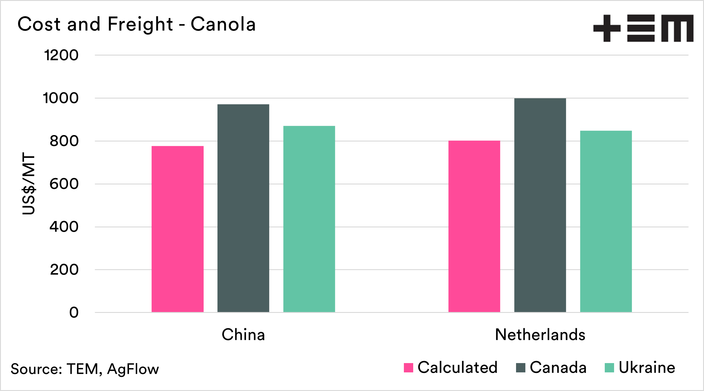 Canola pricing again is excellent at a grower level when we look historically. Last week, I wrote about our disconnect between our physical pricing and futures (see here). This trend is unsurprisingly similar to the cost and freight matrix.