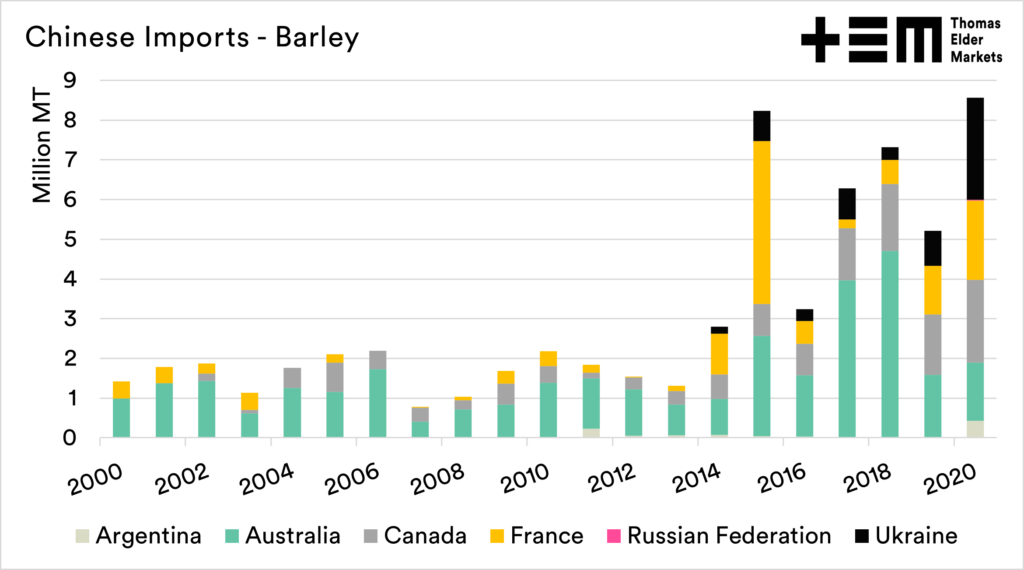 Australia was a major supplier of barley to China up until the anti-dumping tariff was introduced. Since the tariff was introduced, France and Ukraine have been major beneficiaries.