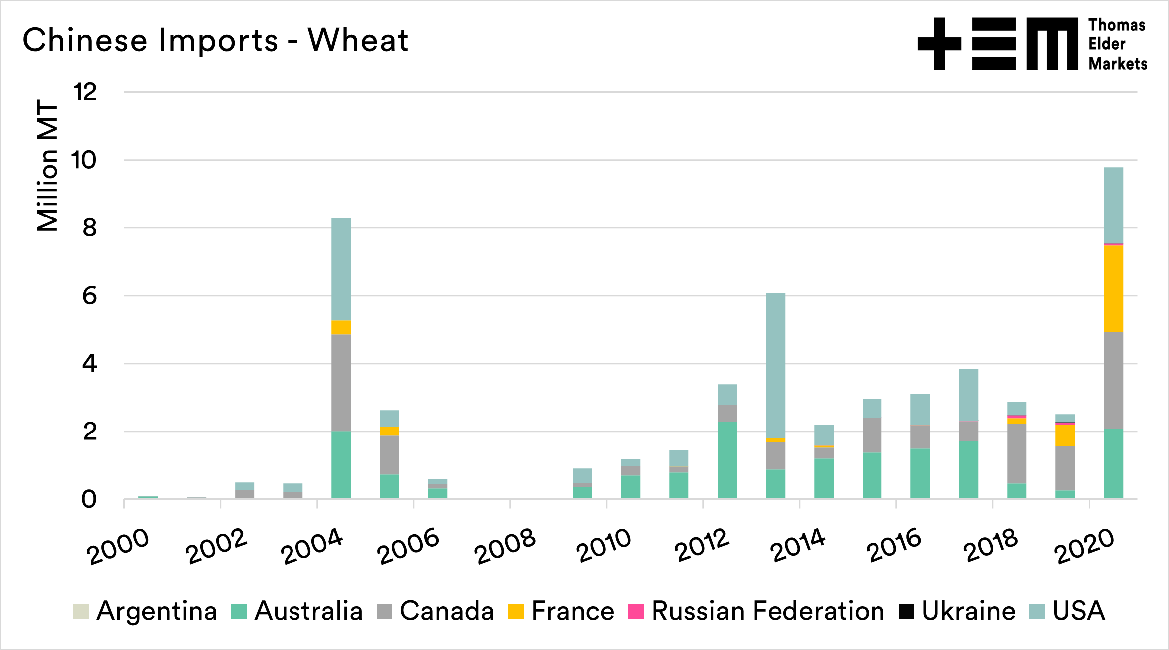 The increase in imports of wheat into China has been huge in recent years (see here). The chart below shows the imports and the major partners from 2000 to 2020, using UN comtrade data. Russia due to restrictions, are barely perceptible on the chart. Australia has been a major player throughout most of the past decade, along with the usual suspects.