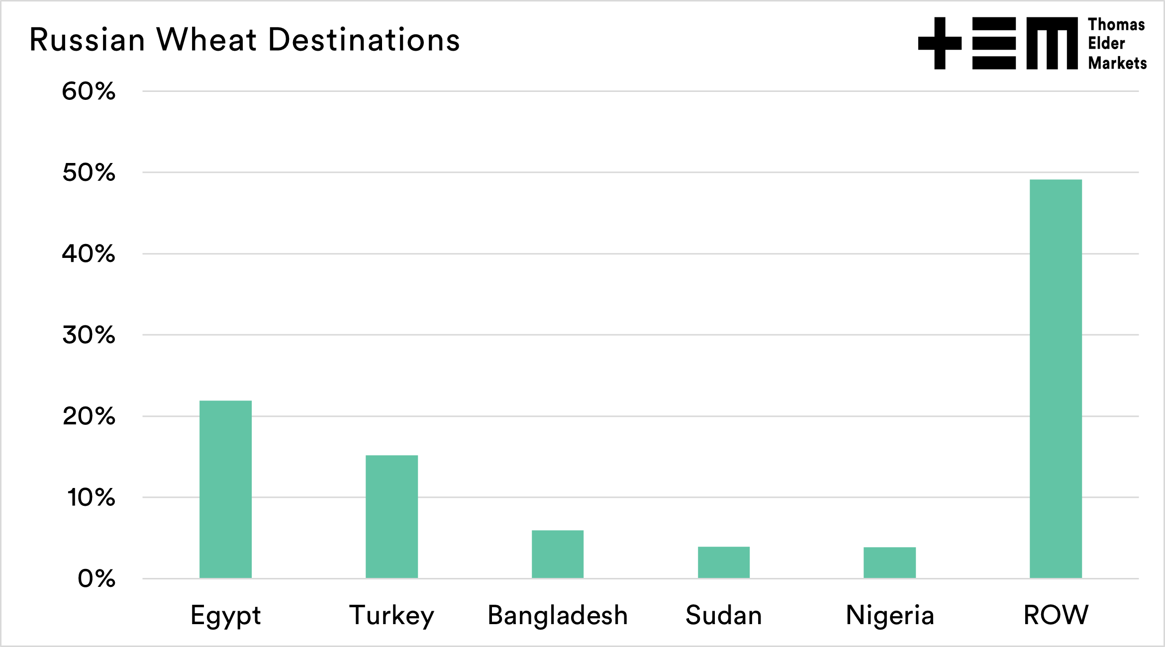 The wheat trade is a lot less concentrated than barley. The wheat trade from Russia is still heavily focused towards the top five, with 51% of volume.