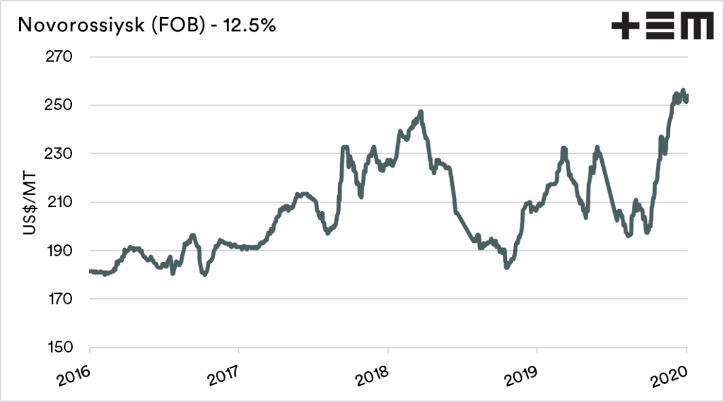 Russian export market remains relatively flat. 12.5% wheat prices in deep-sea ports declined by $1 to $253/mt. The market continues to watch the weather in the Black Sea and follow closely a discussion about potential export restrictions.