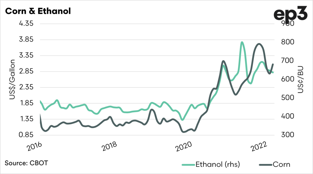 The ethanol is then mixed with fossil fuel and is then fed to vehicles around the US. We can see the relationship between corn pricing in the chart below.