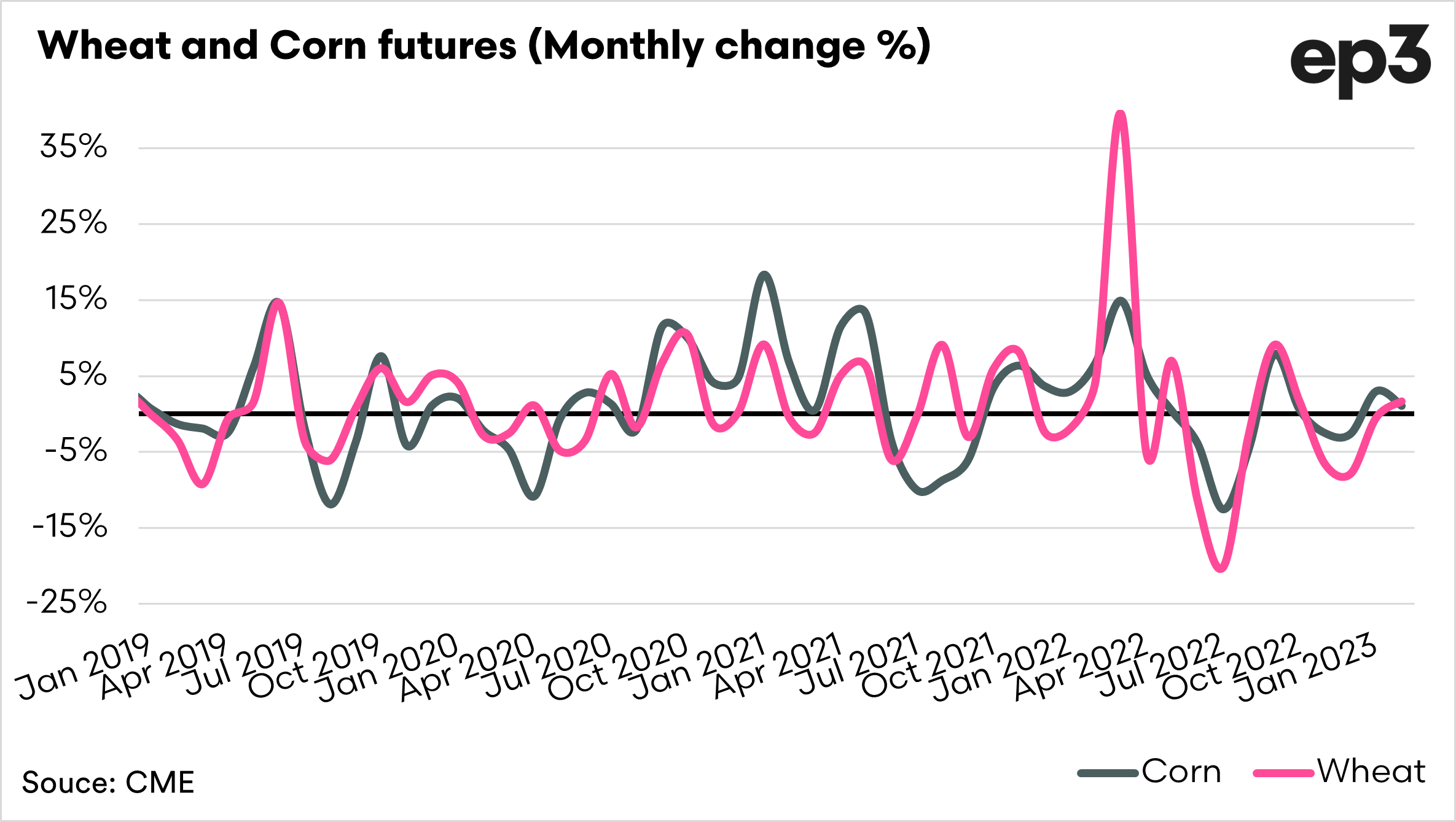 The relationship between the two can be seen in the monthly changes in price. The percentage change (or return) for corn and wheat has shown similar changes in recent years.