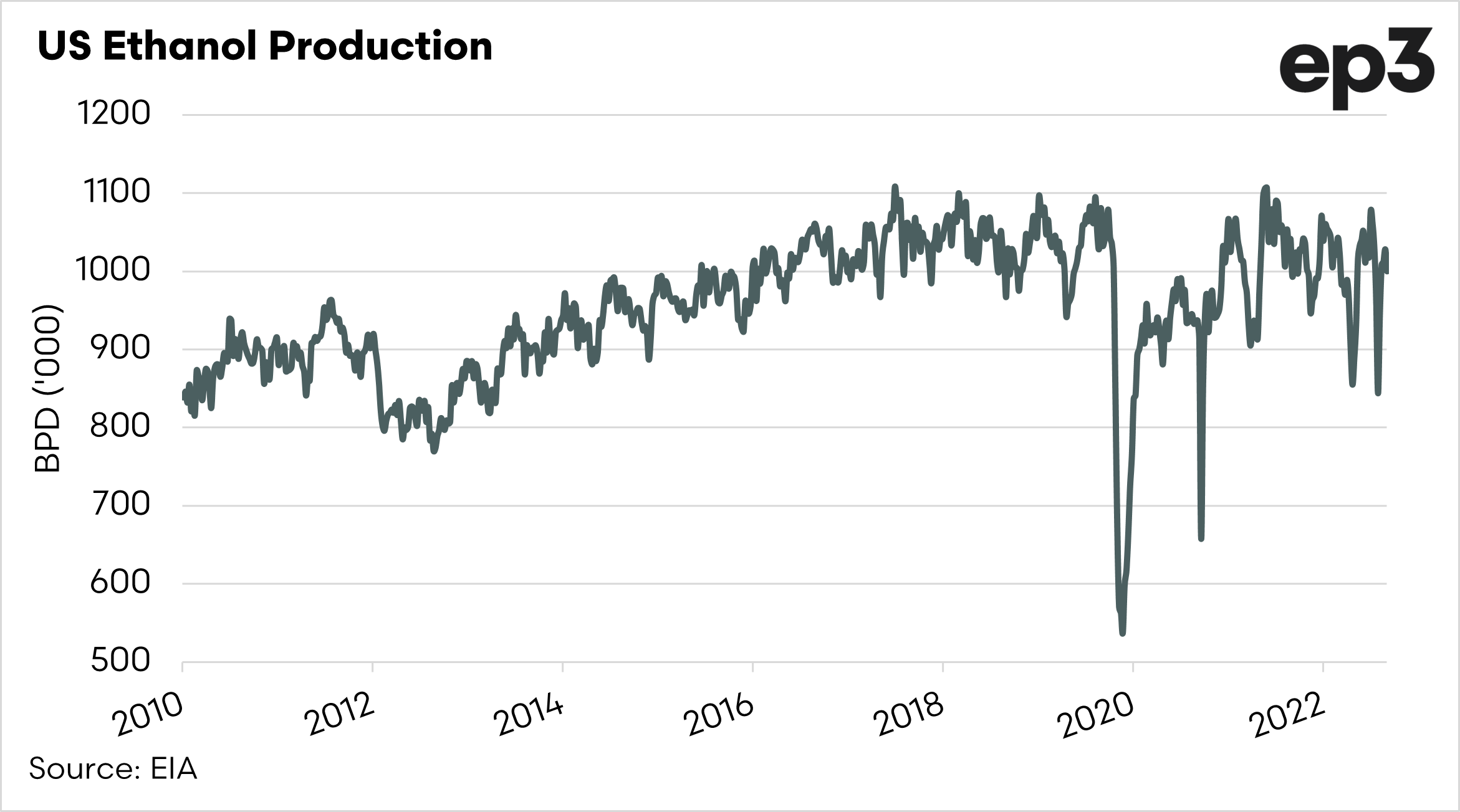 US ethanol production has been growing steadily over the past decade. However it can be choppy. Production is predicated on demand, if demand for fuel drops then clearly ethanol for mixing with fossil fuels drops.