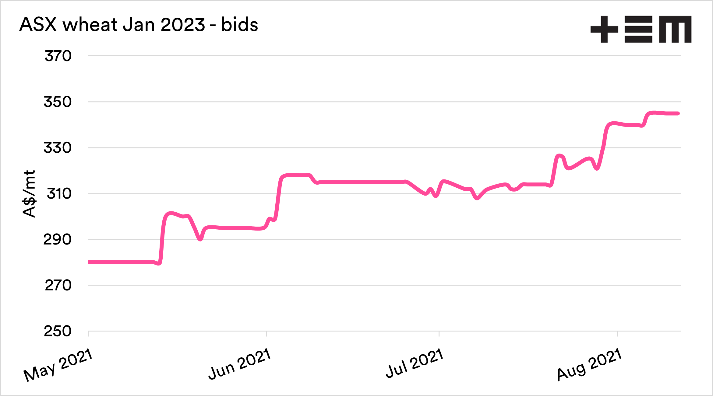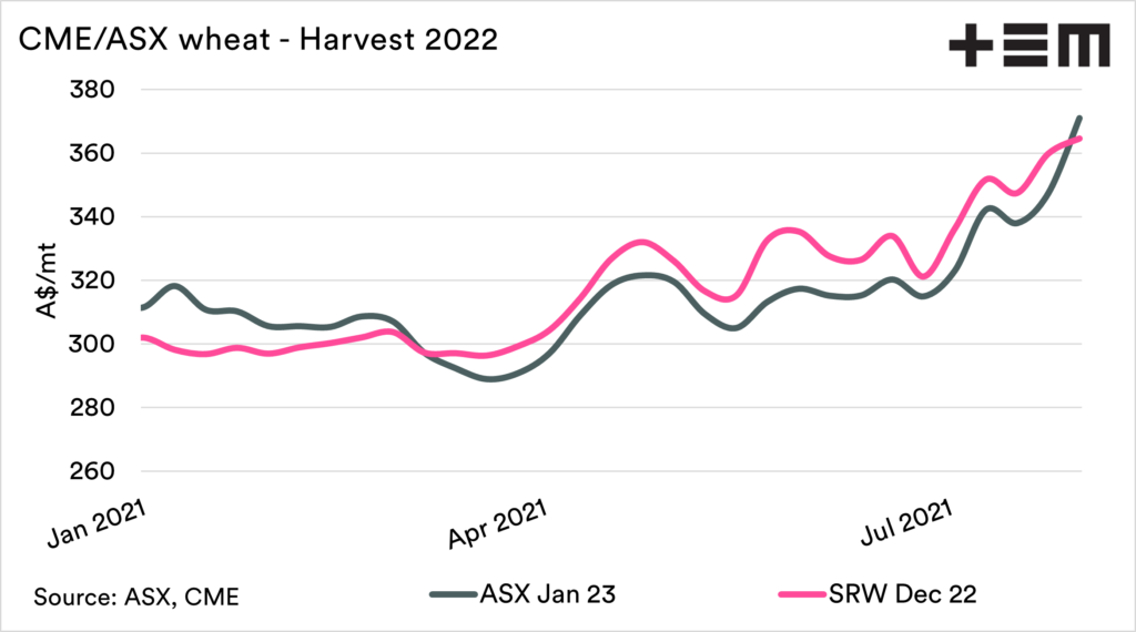What about the next harvest? The chart below shows the ASX and CBOT wheat contracts which correspond with our 2022/23 harvest.