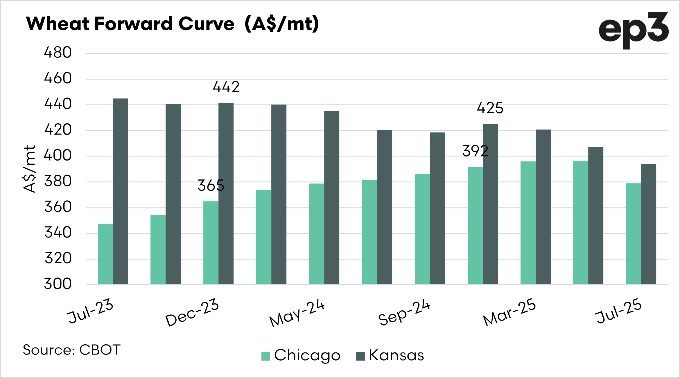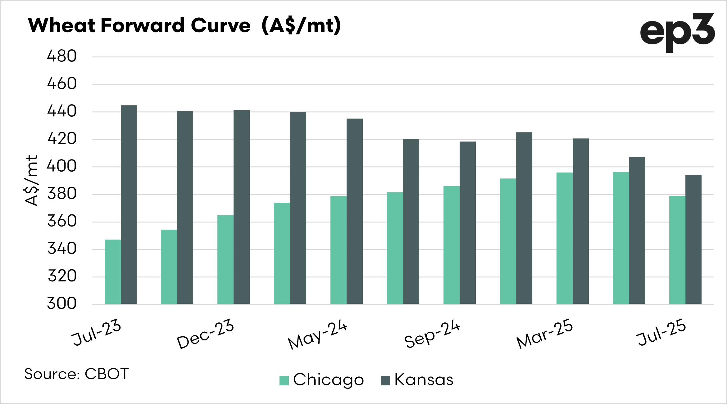 The curve gives an instant snapshot of where you could theoretically buy or sell the commodity. The below chart displays the forward curve for Kansas & Chicago wheat converted to A$/mt.