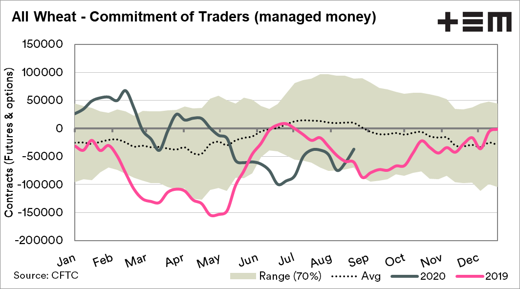In the chart below, the combined position for Minneapolis, Kansas and Chicago wheat derivatives is displayed. In recent weeks we can see that speculators have increased their long position, as an example last week they were -60807 contracts short, this week they are -36915 contracts short.
